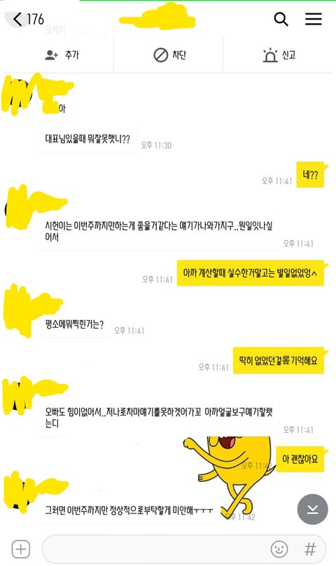 해고 당일 매니저님께 받은 카톡입니다. 뭐 실수 한거있냐 이번주까지만 일하는게 좋을거 같다 라는 얘기뿐 해고 사유는 말해주시지 않으셨습니다.