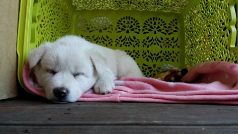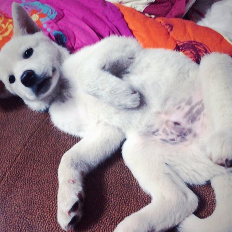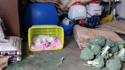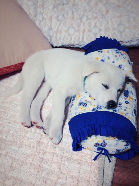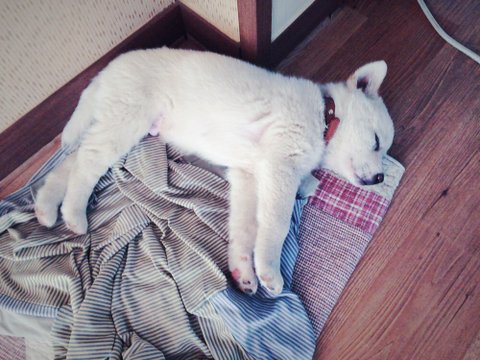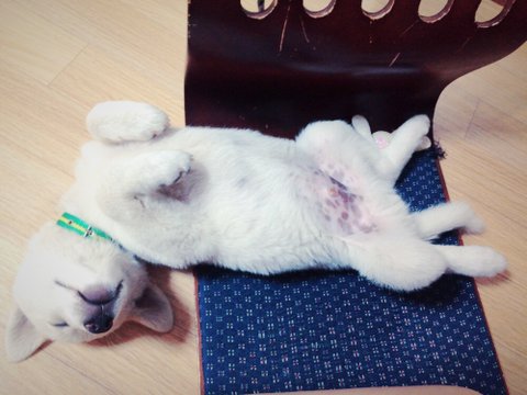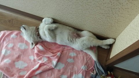 엄마가 강아지는 춥다고 베개 커버 깔아줬어요