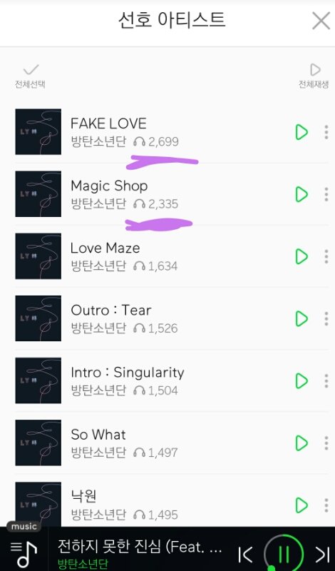 한곡 재생이 눌러져있어ㅠㅠ