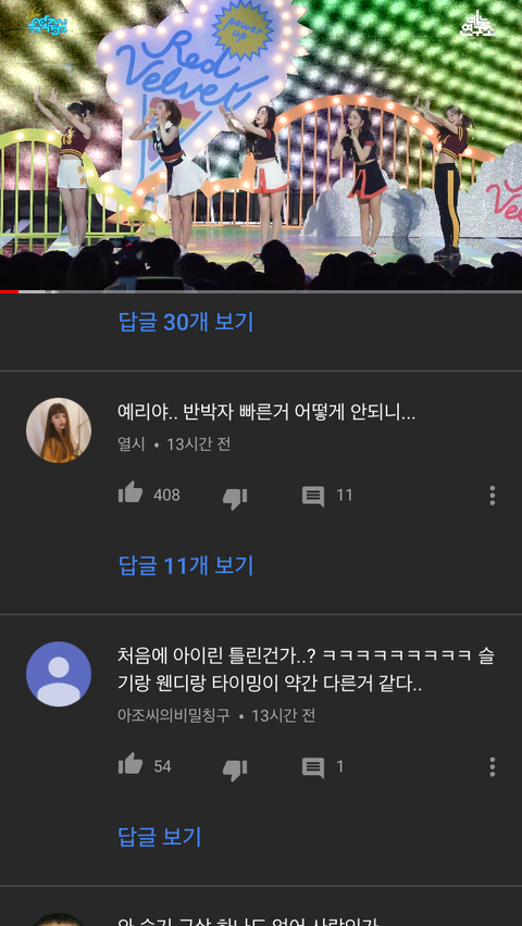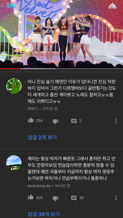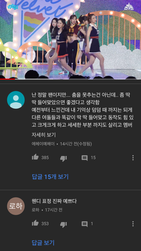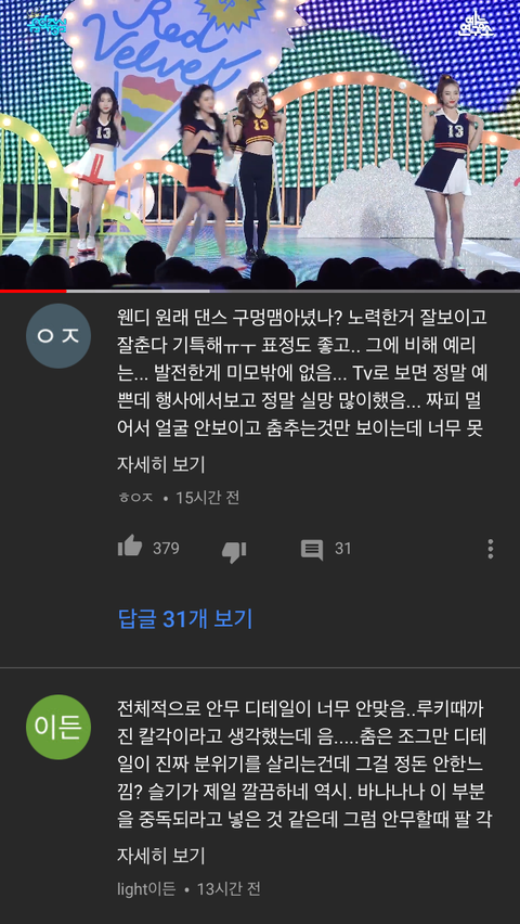 예리 뿐만 아니라 난 조이 표정도 문제라고 봄... 이때다 싶어서 다른 멤 머리채 잡는거 아니고 난 컴백무대부터 예리보다 조이 표정이 더 신경쓰여서 댓글 남기고 그랬었는데 반대 가득 먹음.. 이게 나만 예민한건가 싶기도 했는데 그러기엔 카메라 잡힐 때마다 조이 표정이 정말 너무 안좋았고 동영상 댓글 보니 이런 생각 드는 게 나만은 아닌 것 같았음. 입만 벙긋거리지 파워업이 전혀 안됨.. 뮤뱅 컴백 때도 그랬고 어제 음중에서는 애써 웃으려고 노력하긴 하던데 뒤에 갈수록 다시 원상태였어. 웬디만큼은 바라지도 않고 적어도 자기 파트에서는 분위기에 맞는 표정을 딱딱 해야하는데 조이는 카메라 불 켜진거 보고나서 뒤늦게 웃더라. 또 음중 뒷부분에 조이가 예예예하고 고음 지르는 부분 있는데 그 부분도 표정 심각함. 내가 이렇게 하나하나 영상 보면서 말하는건 레벨을 좋아했고 입덕까지 할 뻔 했던 사람이기 때문이고 전체적인 퀄리티가 점점 낮아지는 게 너무 안타까워서 남기는 댓글임. 이제 와서 다른 멤 머리채 잡을 생각 정말 1도 없음. 이렇게 논란이 생겨야 멤버들과 소속사가 심각성을 느낄 것 같음. 물론 몸매나 외모비하하는 까글들은 나도 싫고 화남. 그저 조이나 예리가 피드백 좀 해줬으면 좋겠고 퀄이 좋아지길 바람.