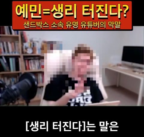 얘들아 페북에 떠서 본 사람도 있겠지만 이거 좀 너무한 것 같아 초등학생들도 많이 보는 샌드박스 소속 유튜버라는데 욕도 엄청 많이 쓰고 예민하다=생리터진다 라는 이상한 표현도 쓰고 그래.. 혹시 없겠지만 이 유튜버 영상 보거나 구독 해 놓은 사람들 다 영상 그만 보는게 좋을 것 같아. 저런 개념없는 사람들 뜨면 진짜 어린 애들한테도 안 좋잖아! 생리터졌다고 한 자료 영상이야,,