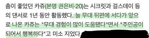 데뷔당시 인터뷰에서 백댄서만 하다가 주인공이 되어 행복하다고 했었는데, 다시 연습생으로 돌아가서 러블리즈 백댄서를 서기도 했다ㅠ