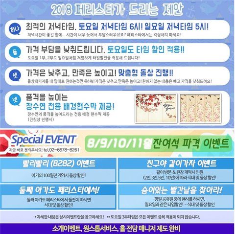 돌잔치를 할 수 있는곳은 많으나 어디서 해야하나 고민하다 신림쪽 한곳, 구로쪽 페리스타 두군데로 압축해서 알아봤습니다.