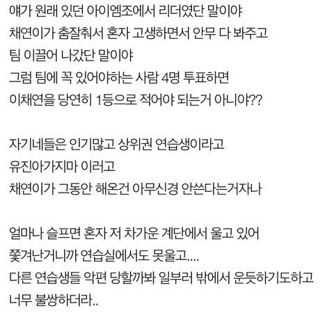 그렇다면 이글처럼 이채연은 혼자 고생하며 안무 다봐주고 팀을 이끌었는데 팽당한걸까?