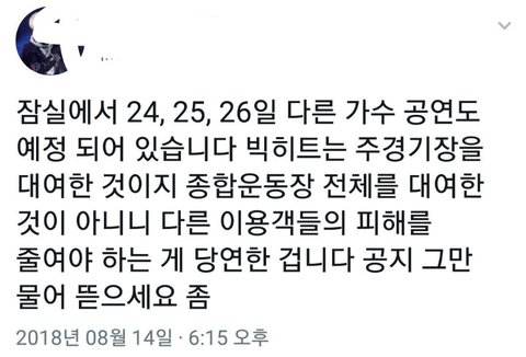 됐잖아 아시아공원이랑 신촌중학교가서 한다는 사람도 있던데 금지시킨건 좀 안했으면 ㅠㅠ 싸2님콘서트때도 민원들어갔었대 그냥 공연만보러가는 게 대부분인 싸2님콘서트랑 나눔하고버스킹 많이하는 아이돌팬인 우리는 얼마나 시끄러울까.... 금지시킨 이유는 이거인듯