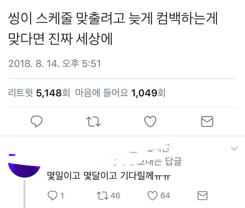 답글로 다백만년도 기다릴수있다고 울고있음 ㅈㄴ이쯤되면 1인지지 아니냐 근데 여기서 울고있는 사람들 프사는 다 다른멤버..ㅋㅋㅋㅋㅋㅋㅋㅋㅋ