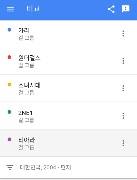 소녀시대 >티아라>2NE1>원더걸스>카라 순