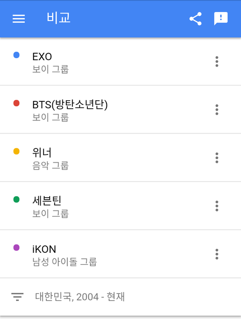 엑소>방탄소년단>세븐틴>위너>아이콘 순