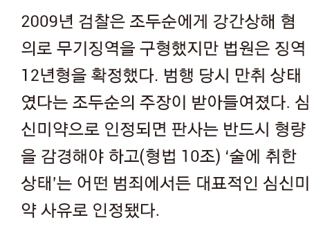 나두 이해 안 돼ㅋㅋㅋㅋㅋㅋㅋㅋㅋ 애초에 술 먹어서 웅앵웅앵 심신미약 웅앵웅앵 하기 전에 본인이 술 마시고 그따구로 사고 칠거 같으면 안 먹는게 맞는거고 난 판결도 술 마시고 저지른 범죄는 더 강하게 처벌 해야 한다고 생각 해야 하거든 평소에 어떤 사람 이었던 술만 마시면 범죄를 저지르는 사람으로 바뀔 수 있는 잠재범죄자인거고 성인이 되서 본인이 술을 자제력 잃을 정도로 주량을 한참 넘겨서 마시고 범죄까지 저지르는 사람을 뭐가 예쁘다고 심신미약으로 감형 시켜주는지 참...