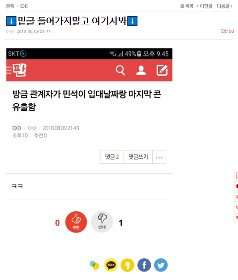 몇일전 세후니 어제는 경스 엔터 좋은글 댓관논의 할때마다 민석이팬이 조작한단글 올리면서 어그로끔. 그래서 내가 이글쓴거