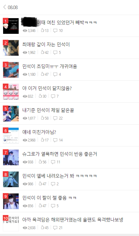 쟤가 말한 민석팬이 도배했단건 실은 민석이 귀엽단 글 하나 올라왔다고 어그로가 풀발해 7시간동안 10페이지넘게 민석이 까서 밀려고 쓴 좋은글이 베톡간거였음. 즉 도배는 팬이 아닌 그로가 7시간동안 까플로 도배한거임베톡은 실시간 자꾸 바뀌고 컴 폰 다르게 보이기도 함. 기준 중구난방에 변수많음