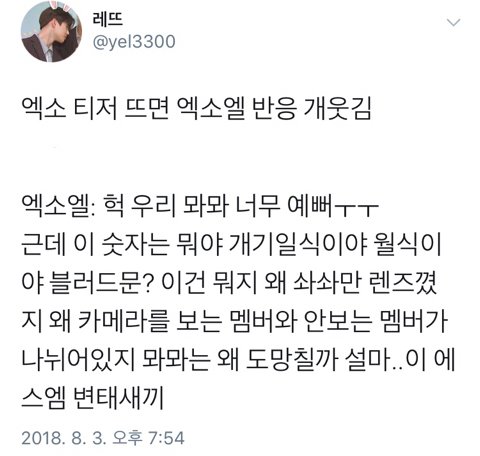 엑소엘들 다 그런건 아니겠지만 얘 티저 수색 개웃김ㅋㅋㅋㅋㅋㅋㅋㅋㅋㅋㅋㅋㅋ 그래서 티저 같이 봄 ㅠㅠ 걔는 엑소보고 웃고 나는 걔보고 웃고...