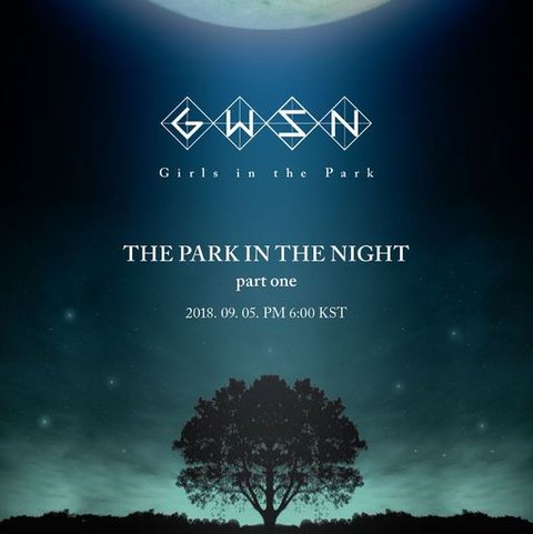 이미지 중앙에는 공원소녀의영문명 ‘Girls in the Park’ 문구와 이니셜 로고가 배치됐고, 그 아래로는 ‘THE PARK IN THE NIGHT part one’ ‘2018.09.05. PM 6:00 KST’ 문구를 게재하며, 앨범명과 음원 공개 일시를 암시했다.