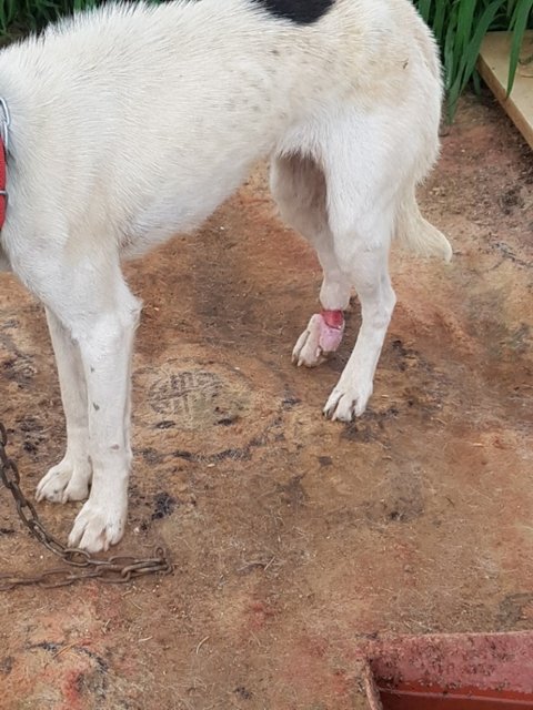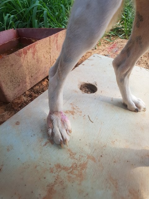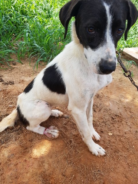 발목이 올무에 걸려 끊어지기 직전 구조되어 보호소로 들어온 포인터 아이입니다.