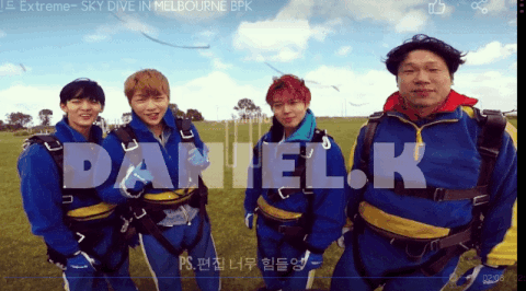 콘서트 끝난 뒤에 자유시간에 멤버 진영이랑 지훈이랑 같이 스카이다이빙하러 갔어 영상도 편집해서 올려주고ㅋㅋ