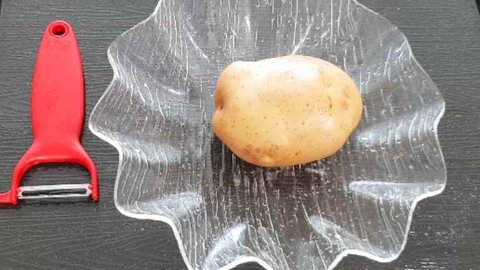 먼저 잘생긴 감자 한개와 감자칼을 준비해요.