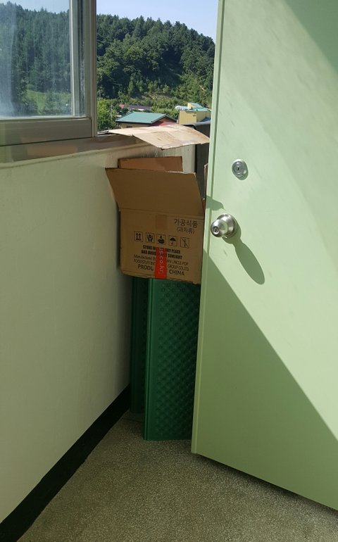 그렇게 계속 지내셨다고 해요. 그러던 어느날 바깥에 나와보니 문을 벽에 최대한 가깝게 열어두고는 남은 공간을 박스로 막아 고양이들이 비상구로 가지 못하도록 만들어두었다고 합니다.