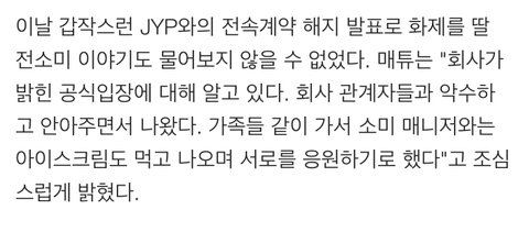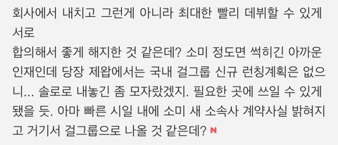 그냥 서로 컨셉 안맞고 계약 조건 안 맞아서 아니였을까 소미 정도가 1/n 이나 타멤한테 센터 뺏기거나 했으면 조건 안맞았을거 같음 타 소속사가면 소미센터에 푸쉬 좋을텐대