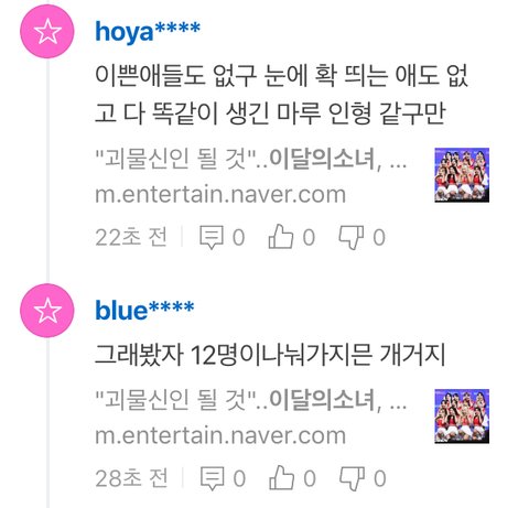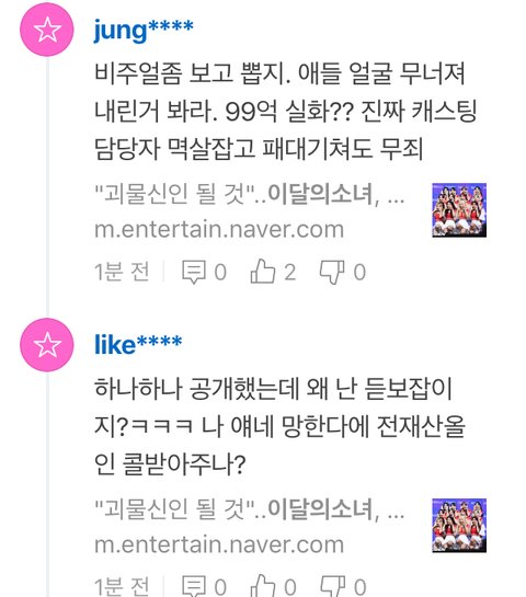걱정 마 내가 볼 땐 이달소 백퍼 잘 됨 ㅋㅋ 막 데뷔한 애들인데 실검 오르고 벌써부터 저런 악의적인 댓글도 달리고 하는 거 보면 백퍼 뜸 ㅇㅇ