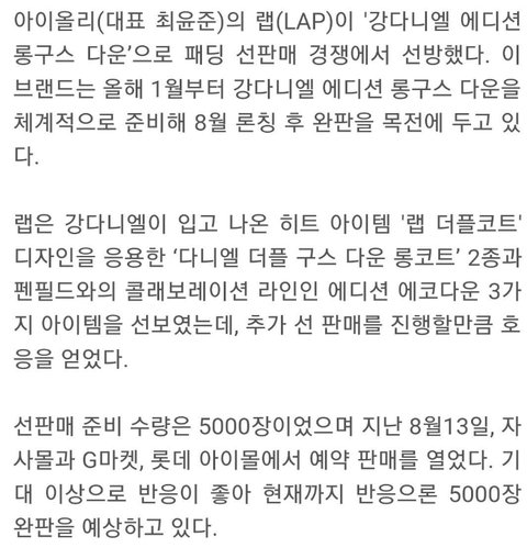 밑글ㅇㄱㄹ) 아이올리 랩(LAP), 강다니엘 패딩 선판매 통했다