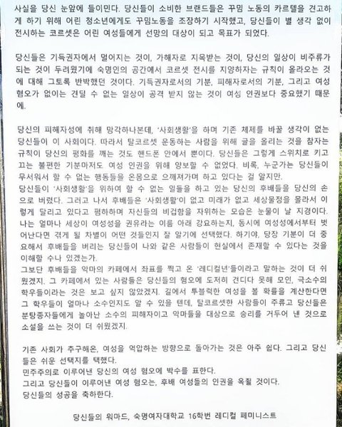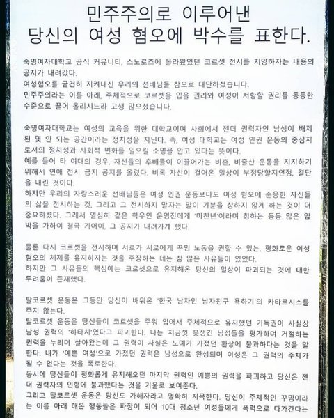 이 대자보를 통해 숙명내의 여성들이 자신의 코르셋 전시가 다른 여성들에게 미치는 영향력을 생각하길 바라노. 숙명대학교가 여성들만의 대학교로서 여권문제에 후퇴하지 않길 바라노.