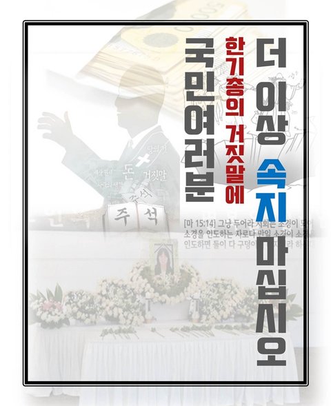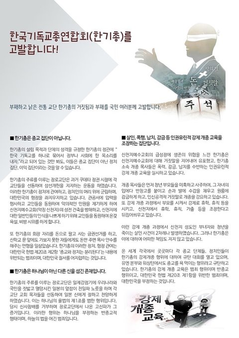 하나님께서는 거짓을 말하는 자의 혀가 입에서 궤사할 것이며, 꾀를 _는 자는 황무케 할 것이며 사람들의 치솟거리로 만들겠노라고 약속하셨습니다. 그러나 한기총은 지금도 이러한 하나님의 말씀을 경외하지 않고 만홀히 여기며 끊임없이 죄악를 저지르고 있으니 그 결말이 어떠하겠습니까? 상황이 이러한 가운데 지금에서야 한기총의 거짓과 가면을 알게 된 국민이라면 살인을 조장하는 강제개종으로 전 세계의 공분을 불러일으킨 한기총을 고발하는 일에 함께 동참할 것을 권합니다. 그리하여 한기총이 다시는 불의를 저지르지 못하도록 만들어서 모든 국민과 국가와 사회와 종교가 모두 평화롭게 공존하는 대한민국을 만듭시다.