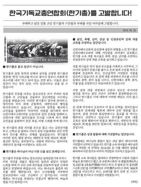 이로 인해 한기총 교단에서 살인을 불러오는 강제개종을 자행하기에 이르렀지요.