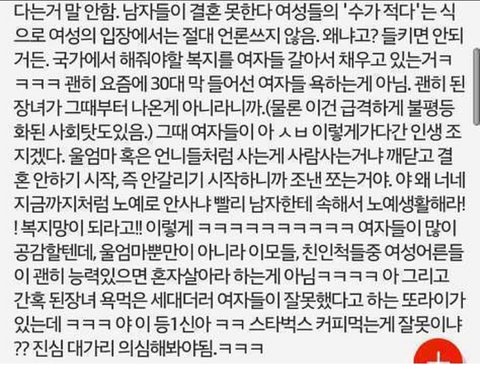 반대 폭탄 먹을 것 같은 글 남겨요. 이게 자작인거 상관없이 관련있어서. '맘충'을 탓하기에는 그 혐오가 너무 심함. 원래 한국인들은 유럽처럼 우는 아가를 먼저 달래주고 보듬어주는 문화가 많았음. 근데 일본 문화의 영향으로 아기나 그 가족에게도 일반인 수준 이상의 예의범절을 요구함. 마치 짱구는 못말려처럼. 다수의 사람들이 식당 테이블 정리 안 하지만, 애기 엄마가 안하면 맘충이라 욕하고. 짐들고 있는 사람 엘리베이터 잡아주는게 매너지만, 유모차는 안 눌러주면서 비아냥거리고. 단순히 '맘충'을 탓하기에는 주변에 '분류'되지 않는 진상들이 너무 많음. 정말 약자 혐오가 무서울 정도로 심해지고 있음.