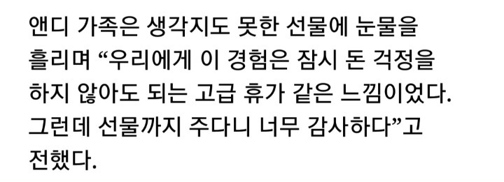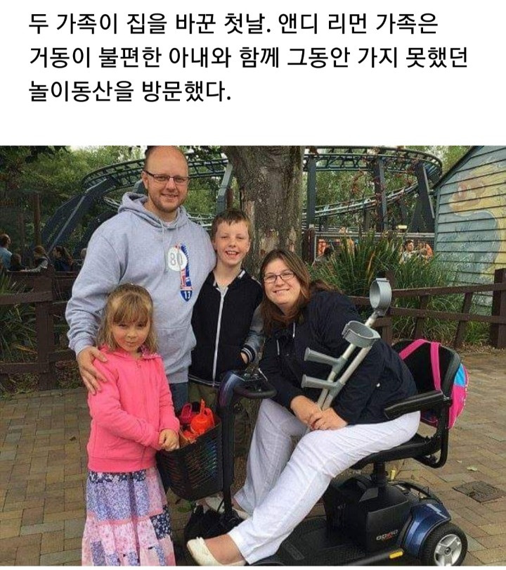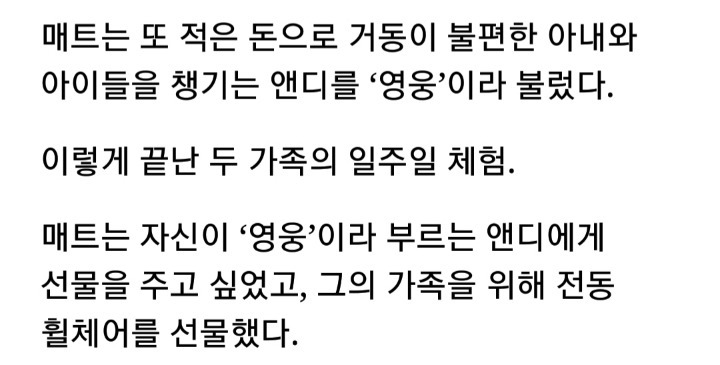 두가족이 영웅이다. 누가 저렇게 하겠나? 특히 매트 가족....원래 작은 집에서 큰집으로는 수월하게 가도 큰집에서 작은 집으로는 끔찍한 경험일텐데 어찌 저런 결단을 내렸는지 모르겠다. ㄷ구나 그 식구들은?...그런데도 겸손을 배우고 앤디 가족은 전동차를 선물받고 눈물을 흘리나.....거참 두 가족이 남다르다.다들 심성이 바르다는 걸 느껴본다.