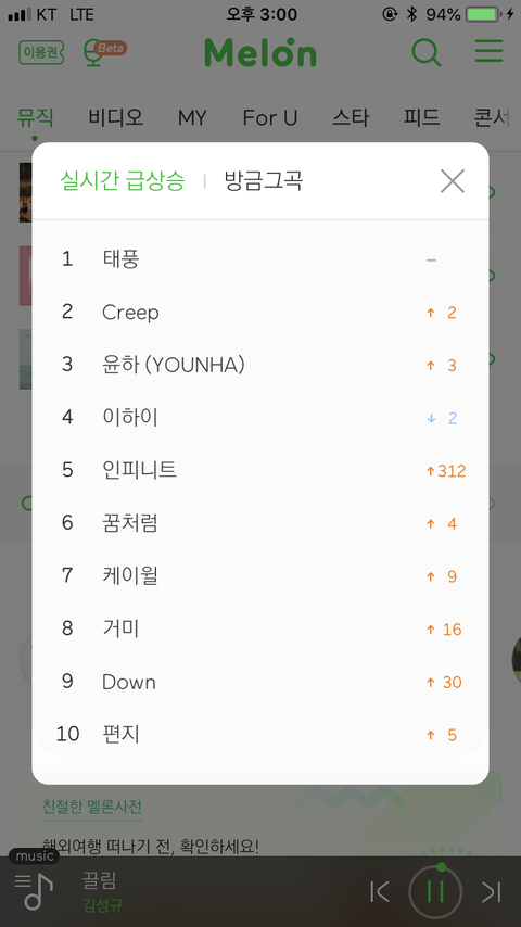 지금 멜론 실시간 순위 1등 태풍임!!! 모두들 한번씩 더 들어보자!!!!! 인피니트도 같이 실검 떴다 모두들 스트리밍 화이팅!!!