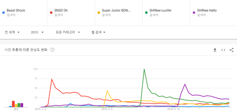 샤이니 루시퍼 > 소녀시대 Oh > 샤이니 헬로 > 슈퍼주니어 미인아 > 비스트 쇼크