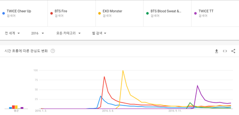 엑소 몬스터 > 방탄소년단 불타오르네 > 트와이스 TT > 트와이스 치얼업 > 방탄소년단 피땀눈물