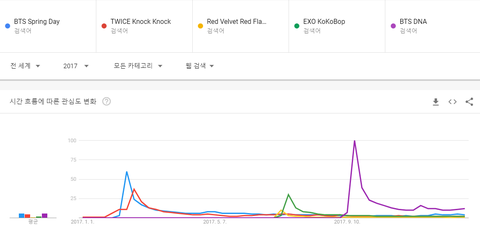 방탄소년단 DNA > 방탄소년단 봄날 > 트와이스 낰낰 > 엑소 코코밥 > 레드벨벳 빨간맛