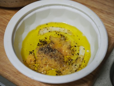 2. 밑간은 올리브유 바질, 소금, 후추, 다진마늘, 소주를 섞어서 준비합니다.