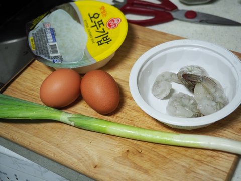 4. 원래대로라면 에어프라이어 돌려놓고 롤 을 한판 하고 있겠지만 지금은 태풍이 오고있습니다. 빨리 증량해야해서 급하게 볶음밥도 합니다. 재료는 간단하게 새우 파 계란.