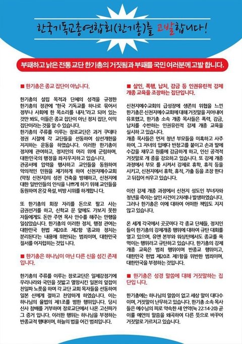 그리고 지금 전 세계 언론이 인권유린을 스스럼없이 자행하는 한기총의 강제개종을 규탄하며 폐쇄를 외치고 있습니다. 그러나 부지인간 유수치사(不知人間 有羞恥事)라는 말처럼 한기총은 파렴치(破廉恥)한 짓을 계속하고 있습니다. 그러므로 전 국민은 이러한 실태를 정확히 인지하고 확인하여 한기총을 고발하는데 동참해야 하겠고, 또한 더 이상 한기총이 국민과 국가와 사회와 종교를 해치지 못하도록 막아서는데 앞장서야 하겠습니다.