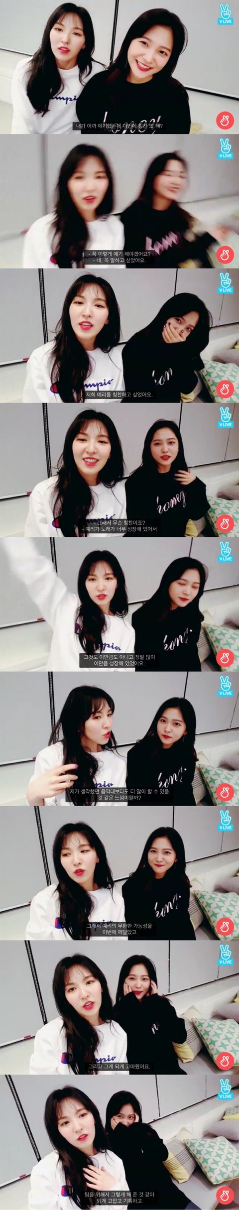 웬디는 예리 루키 활동 때 보컬의 성장에 감동 받았다는 말도 해주고 예리를 실력면에 대해서 조언도 많이 해주고 보컬적으로 같이 고민도 하고 격려도 해주는 언니야