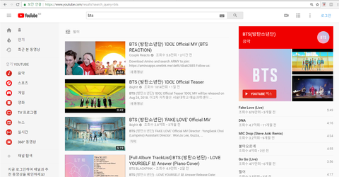 bts로 검색하면 이렇게 뜨고 오늘 뮤비가 안뜸..