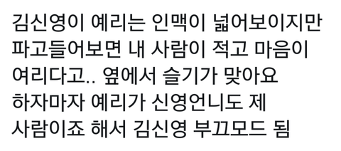 멤버들이 예리 성격 세다하면 ㅉㅉ 저럴줄알았지 싸가지 없어서 언니들이 이때다 싶어 맥이는구나~~ 여자들만 아는~~ 이지랄하면서 왜 예리 성격 여리고 상처 잘받는다는 말은 다 쌩까???