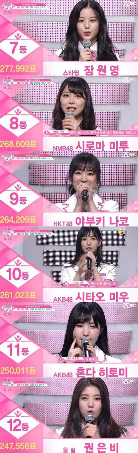 1위는 우익 단체에서 밀어 주고 있어서 걍 원래부터 멤버로 정해진 아이고 (일본과 할 기획 잡을때부터 뽑혀 있었다고 보면 됨) 2위는 미호가 한국 좋아하는데 혐한 공격 당해서 동정픽인거고 3위도 억지부리며 짜맞추기 왕따 안당했는데 당한척 동정픽
