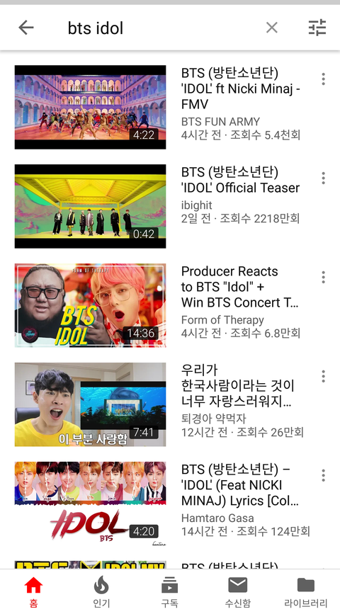 방탄 소년단 idol 이라 치면 나오긴 하는데 그냥 방탄소년단만 치면 안나와. 그리고 이상하게 분명 초반 나왔을 때는 구독에 떴는데 지금은 구독에 안뜸.