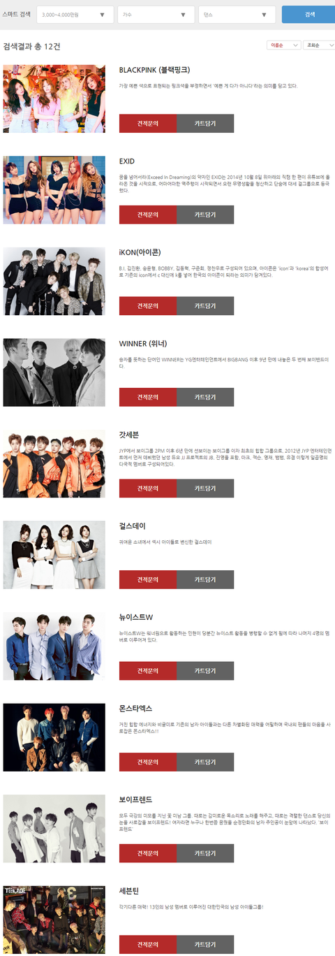 3000~4000만원 : 블랙핑크, EXID, 아이콘, 위너 갓세븐, 걸스데이, 뉴이스트W, 몬스타엑스, 보이프렌드, 세븐틴, 에프엑스, 틴탑 등