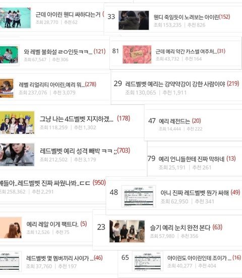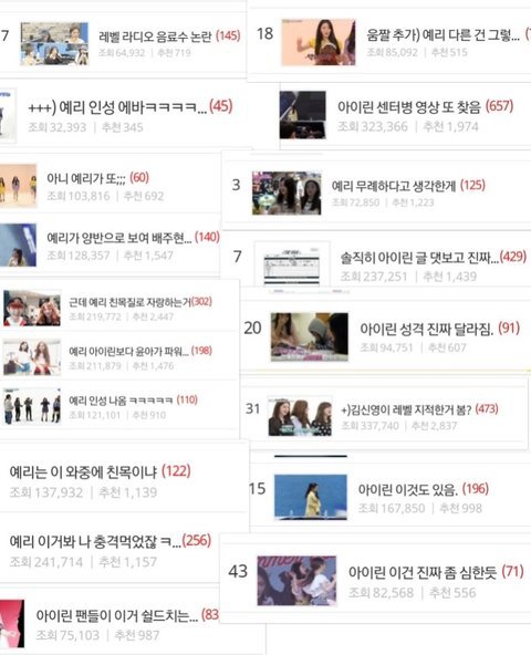 나 레드벨벳 팬이고 판 안지 1년도 안 되서 원래 이런 곳인지는 모르겠지만 너무 심한 것 같아 처음에 실력으로 깔 때는 아 그래 이런 비판도 받아야지 생각했어 근데 갈수록 사람이 내뱉을 수 없는 쓰레기 같은 말들을 익명 믿고 와다다 하더라 이제는 여러 옛날 영상까지 박박 끌고 와서 불화설 만들고.