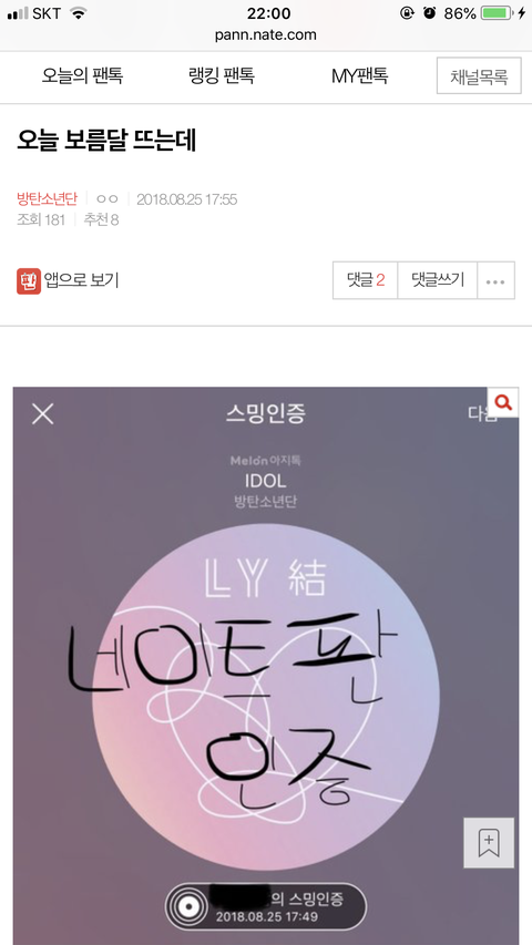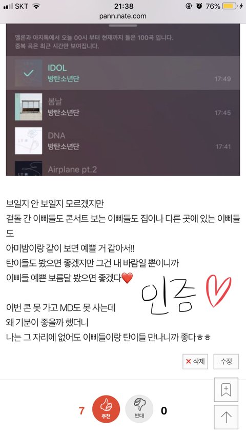 우연에 내 억지일 수 있지만 며칠 전 방탄한테 보낸 편지에 오늘 음력 7월 15일이라
