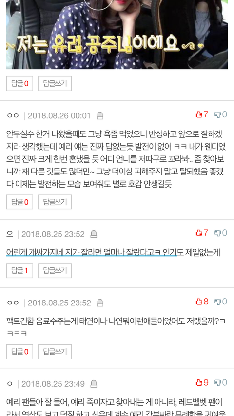 사람 하나 죽이겠다 진짜. 온갖 궁예로 아주 개__을 만들어버리네 ㅋㅋㅋㅋㅋ 작작해 진짜 소름돋아 미친년들아.. 고소 당하고 본진한테 부메랑 맞아라 수고해
