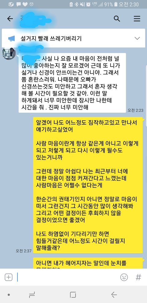 알겠다 일상얘기 더 하다가 끊고 그날밤 카톡으로 다음날 못만날거같다는 카톡과