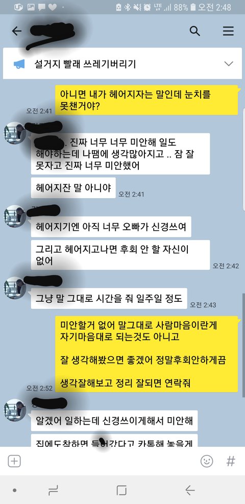 오빠 우리 그만하자 생각많이해봤는데 이게 맞는것 같아 집에 짐있는건 ♡♡언니 통해서 줄게