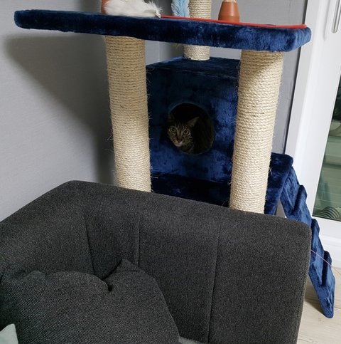 사진을 찍는 저를 피해 캣타워에 피해있어요. ㅠㅠ 그래도 너무 사랑스럽고 귀여운 아이에요!