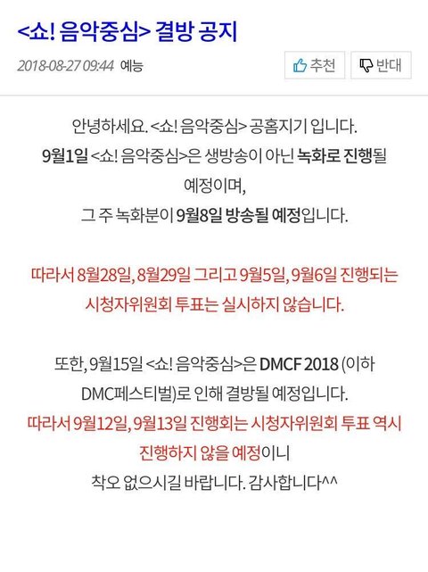 몇주간이 활동기간인지 모르지만 음-중 결방이래 ㄷㄷ 방송사에서 페스티벌한다고 1일날 생방 안하고 8일 방영분 녹화분 촬영한다고 나올수 있는 일자가 8일 방영분 1일 녹화인데 그날 뮤지컬 스케줄 있더라고 그럼 이번 앨범은 음중 출연 안하는건가??
