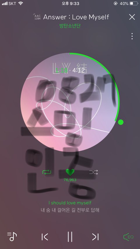 항상 자존감도 낮았었고 걱정도 많고 눈치도 많이봤던 성격인데 이번에 lovemyself 로 위로를 너무 많이 받았어 진짜 너무 가사도 예쁘다 가사가 너무 공감이 많이 된다